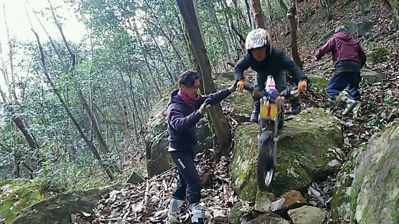 陣くん、3mほどの岩盤登りが登れずに、バイクを放り投げて後ろにひっくり返って大の字に寝ていますが、怪しげな老人がやおら出てきて「最高、最高」と言っています。